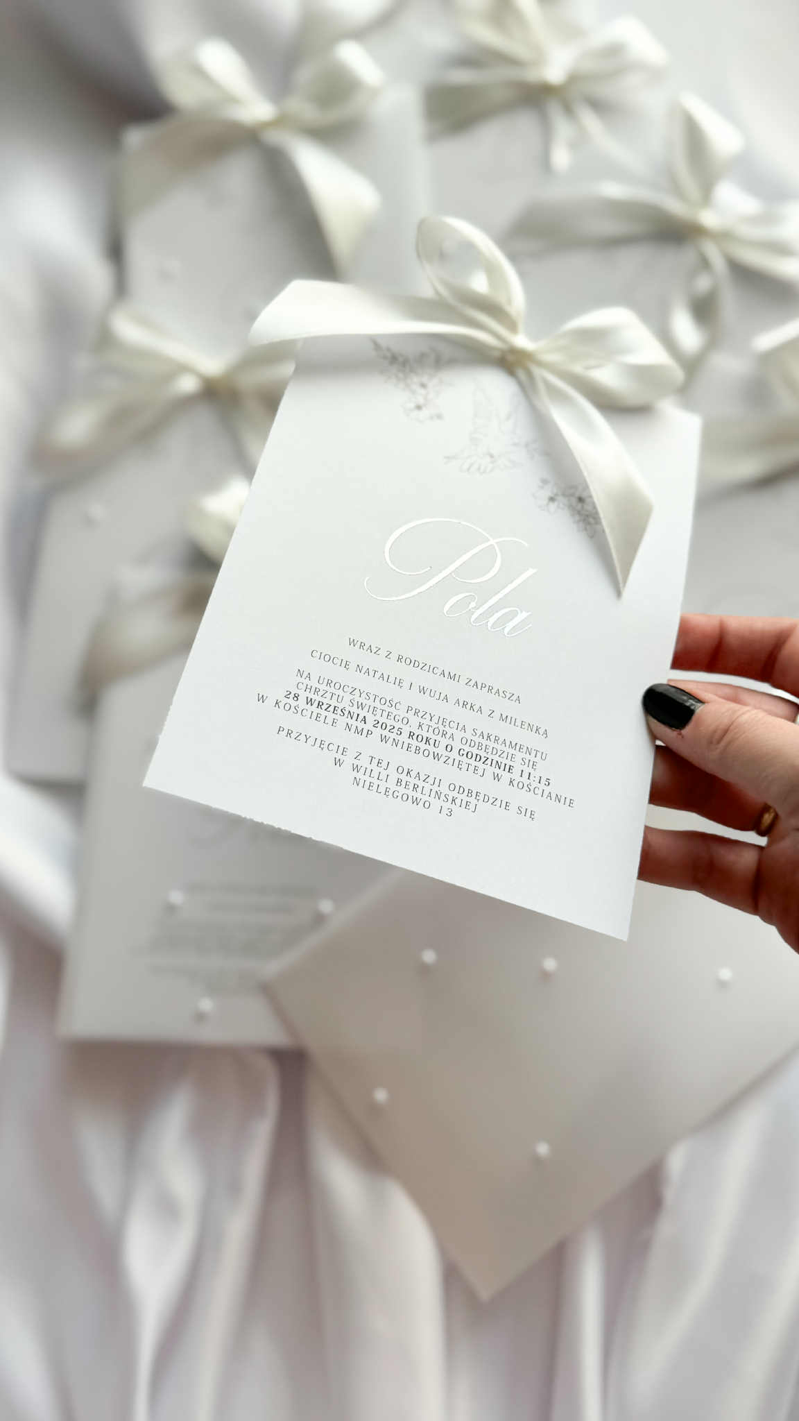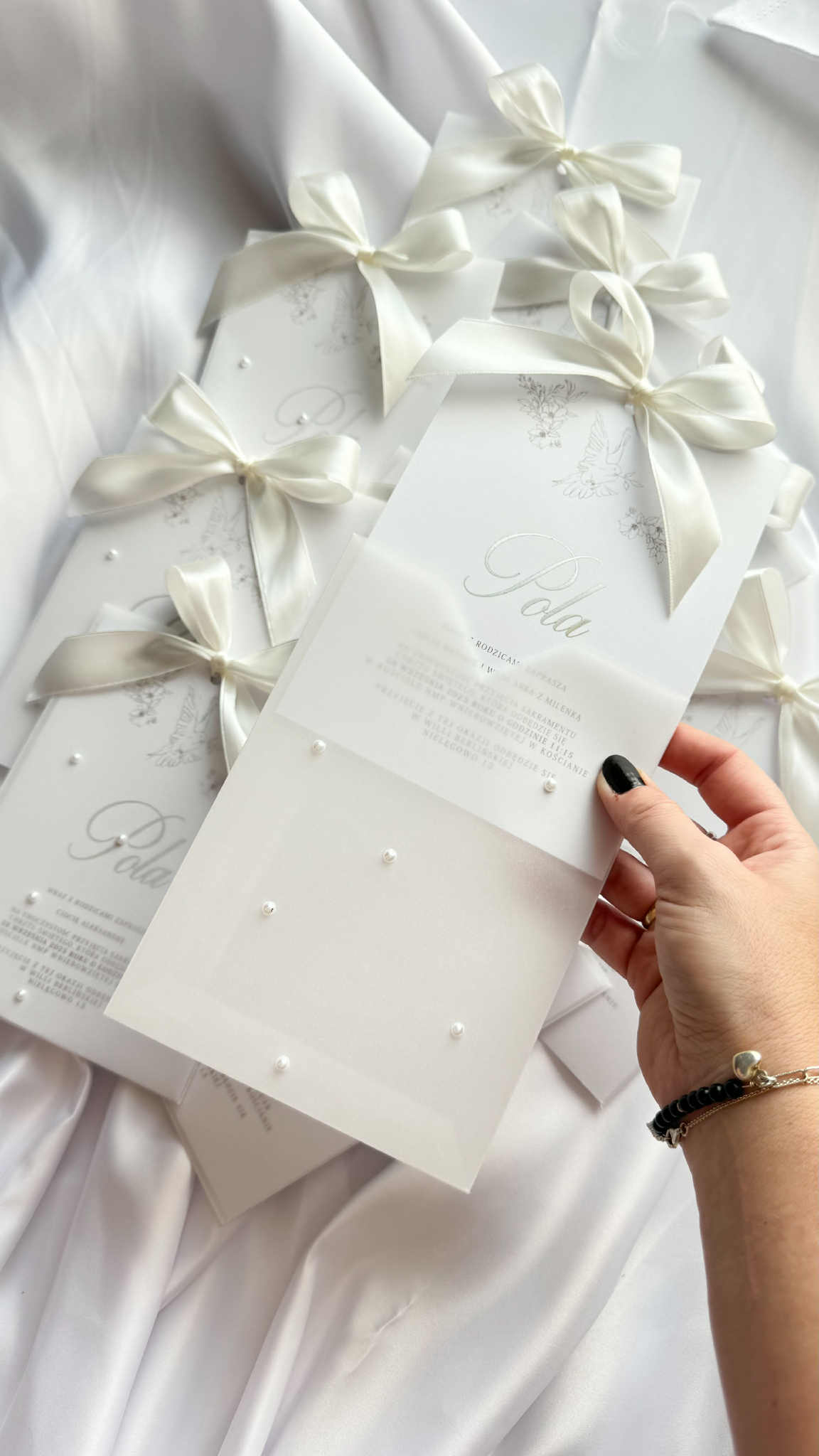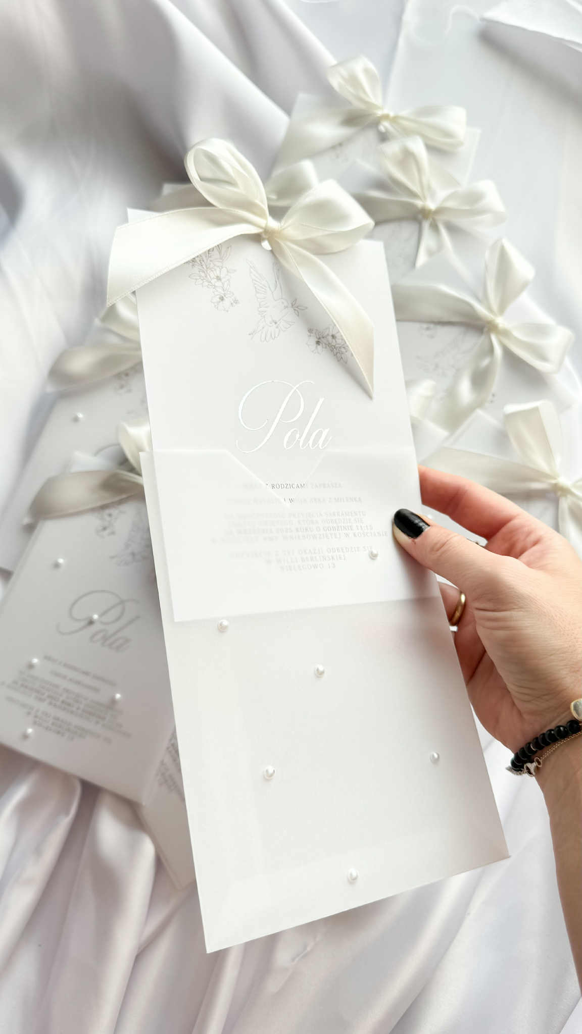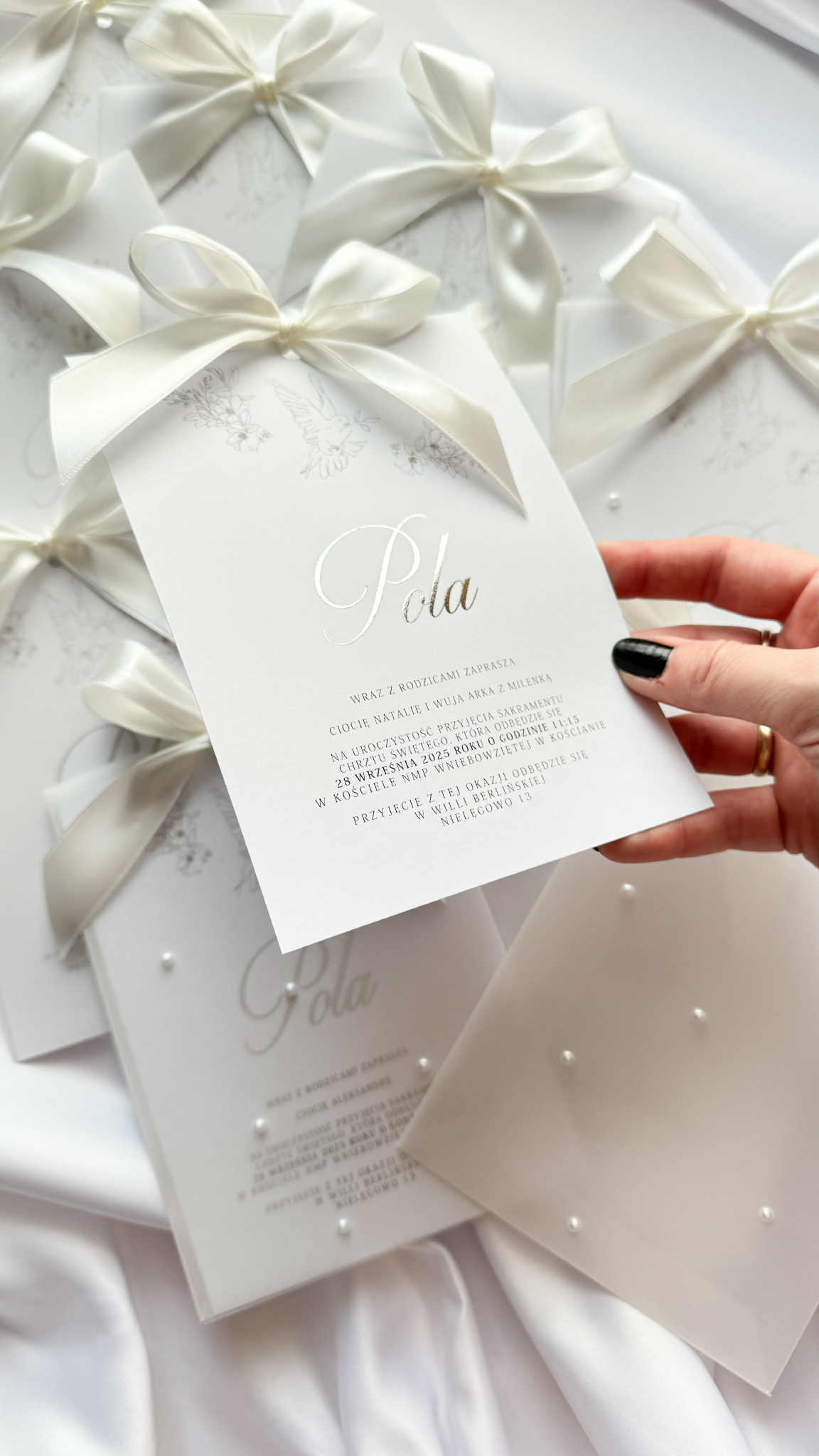 Karta zaproszenia wykonana jest na gładkim papierze o gramaturze 350g. Imię dziecka (lub pary młodej jeśli chcecie zamówić je w wersji na ślub) uszlachetniona jest folią srebrną (widoczną na zdjęciu), lub złotą (o swoim wyborze napisz nam w komentarzu do zamówienia). Całość zaproszenia zamknięta jest w ręcznie robionej kieszonce z transparentnego papieru ozdobionego perełkami. Dodatkowo karta przewiązana jest satynową wstążką w kolorze ciepłej bieli (kolor może być dowolny – dopasujemy ją do Ciebie), co doskonale podkreśla lekkość i delikatność tego zaproszenia.