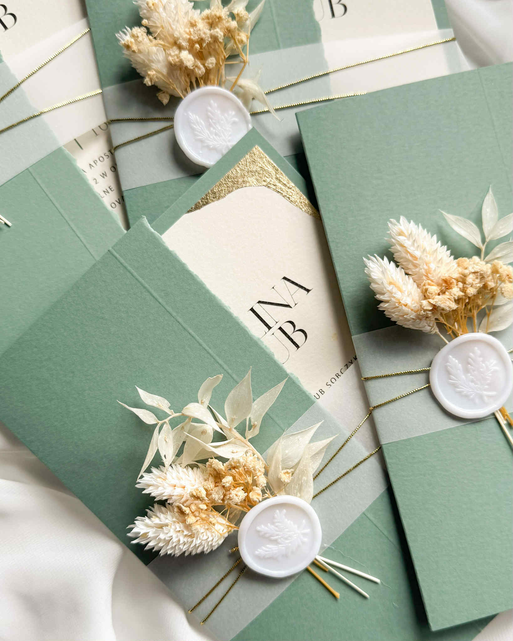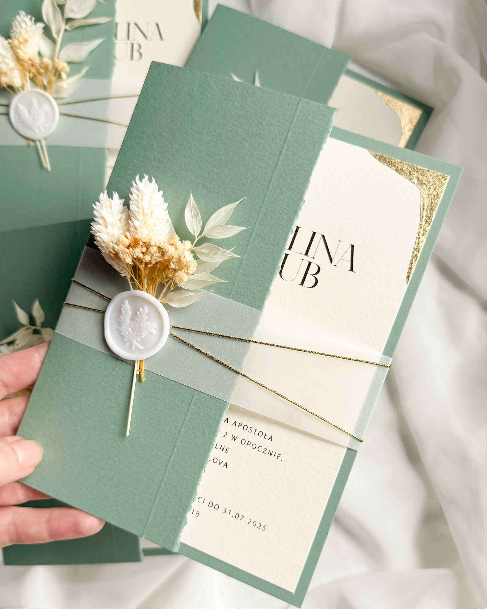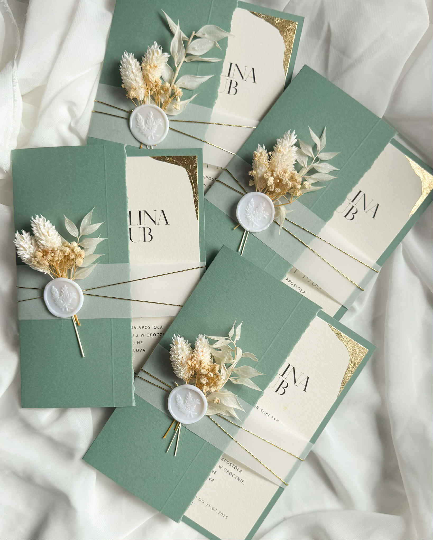 Na zdjęciu zaproszeń w zielonej wersji jest dodatkowa opcja – złocone brzegi – jeśli chcesz aby Twoje zaproszenie tak właśnie wyglądało – nie zapomnij tej opcji dodać 🙂