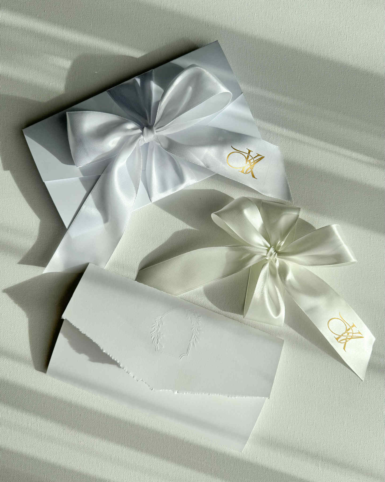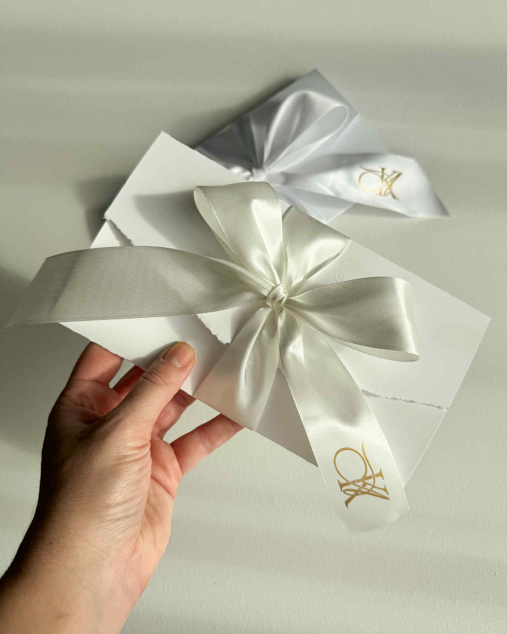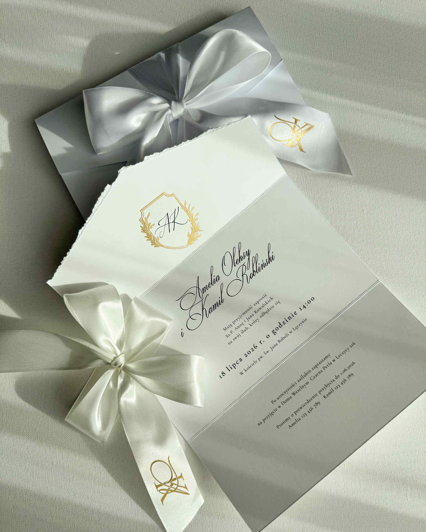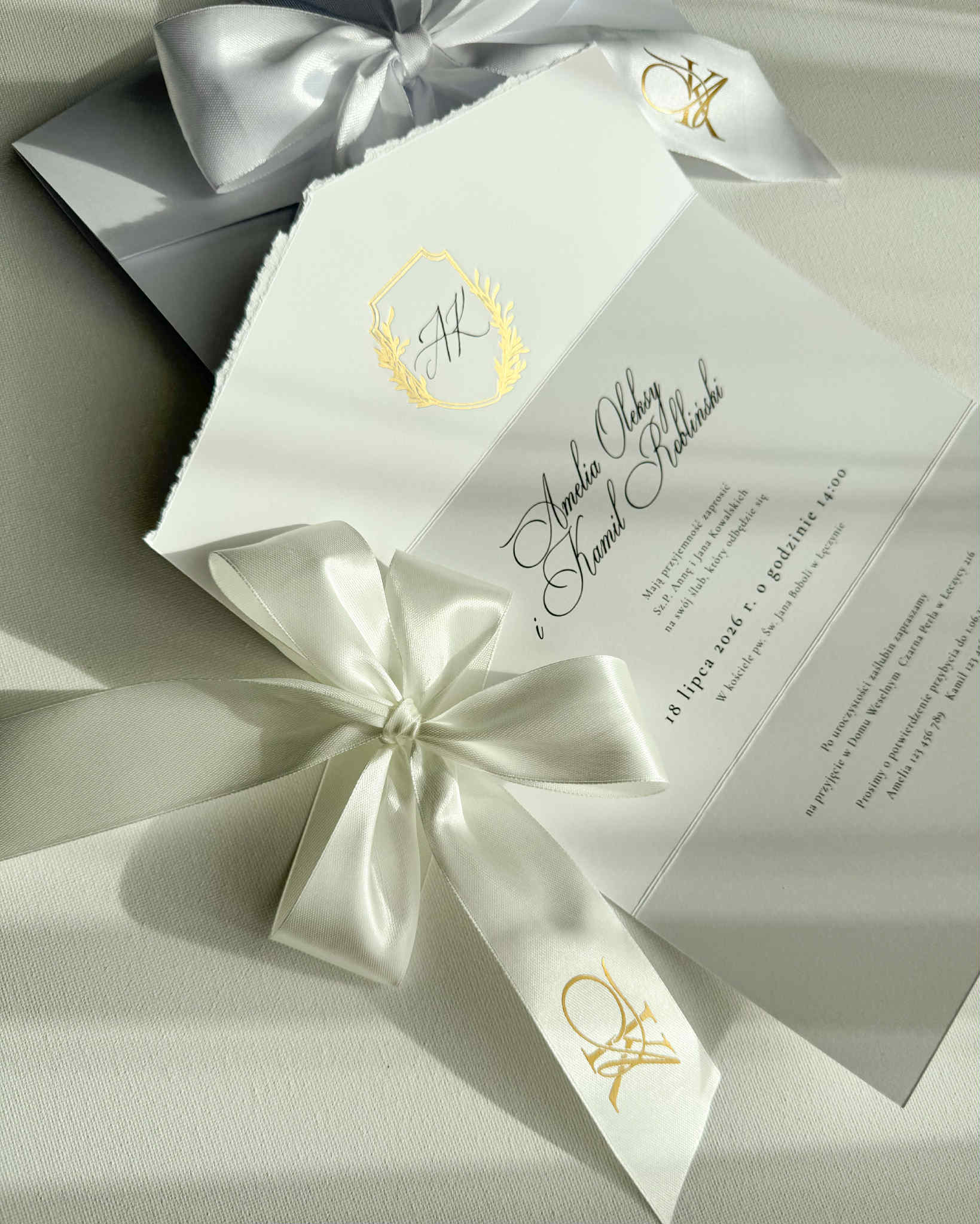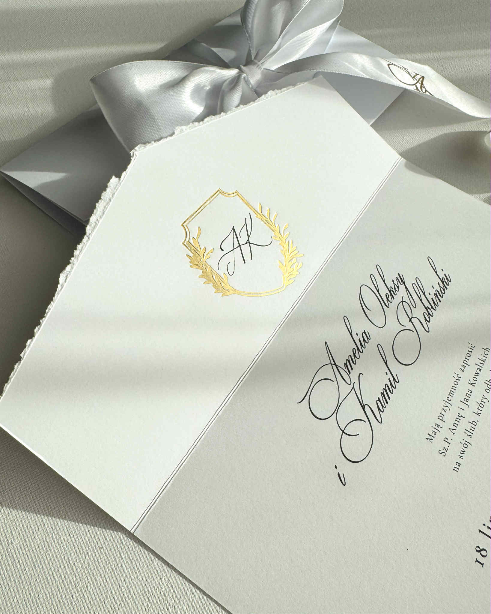 Zaproszenie po rozłożeniu ma format ok 21x29cm. Możesz zamówić je w wersji z rwanymi lub prostymi brzegami. Kokardę dopasujemy do odcienia papieru (na zdjęciu widoczne off white – rwane brzegi, oraz biała – gładki brzeg), lub w dowolnym innym kolorze wybranym przez Was. Kokarda jest personalizowana Waszymi inicjałami