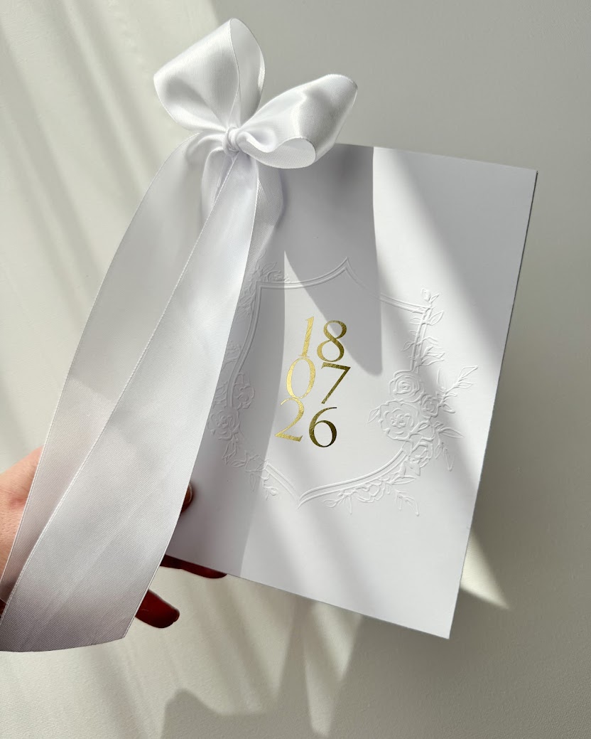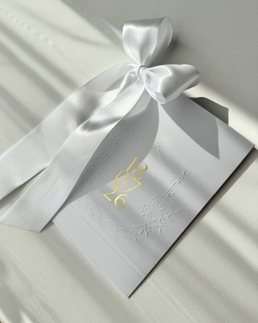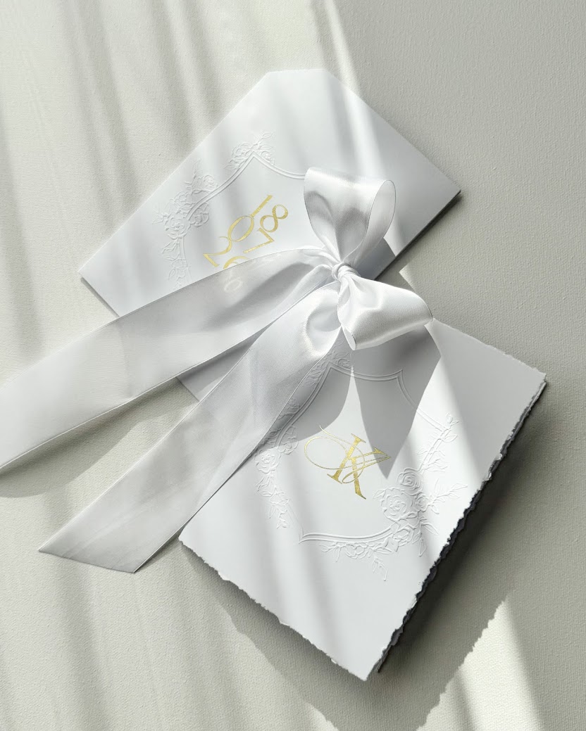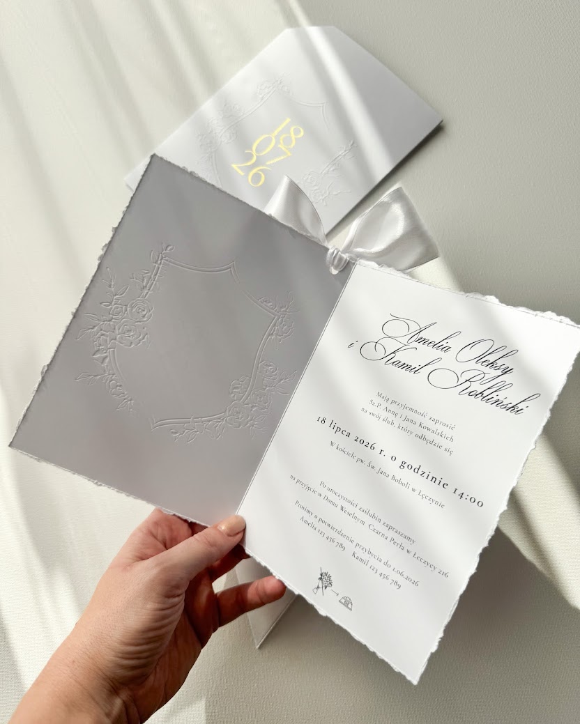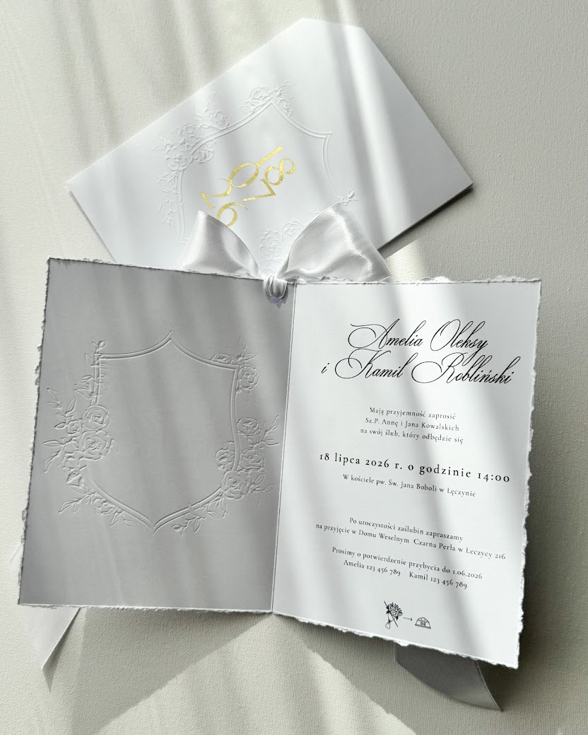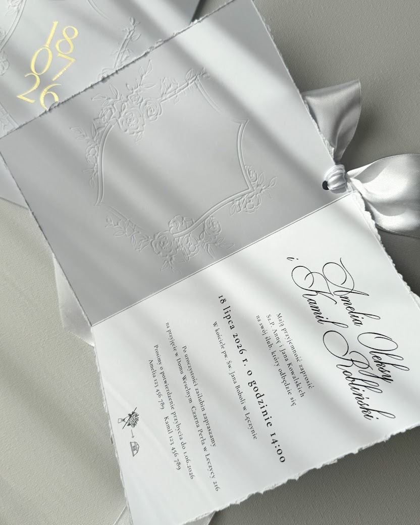 Zaproszenie wydrukowane jest na satynowym papierze (300g) z ręcznie rwanymi brzegami. Inicjały mogą być uszlachetnione folią metaliczną złotą, lub srebrną (na zdjęciach złota), lub być wydrukowane w dowolnym kolorze. Karta jest przewiązana kokardą (jej kolor jest dowolny). Całość zamknięta jest w kieszonce (300g) ze specjalnym wycięciem na kokardę, tłoczeniem wypukłym oraz datą.