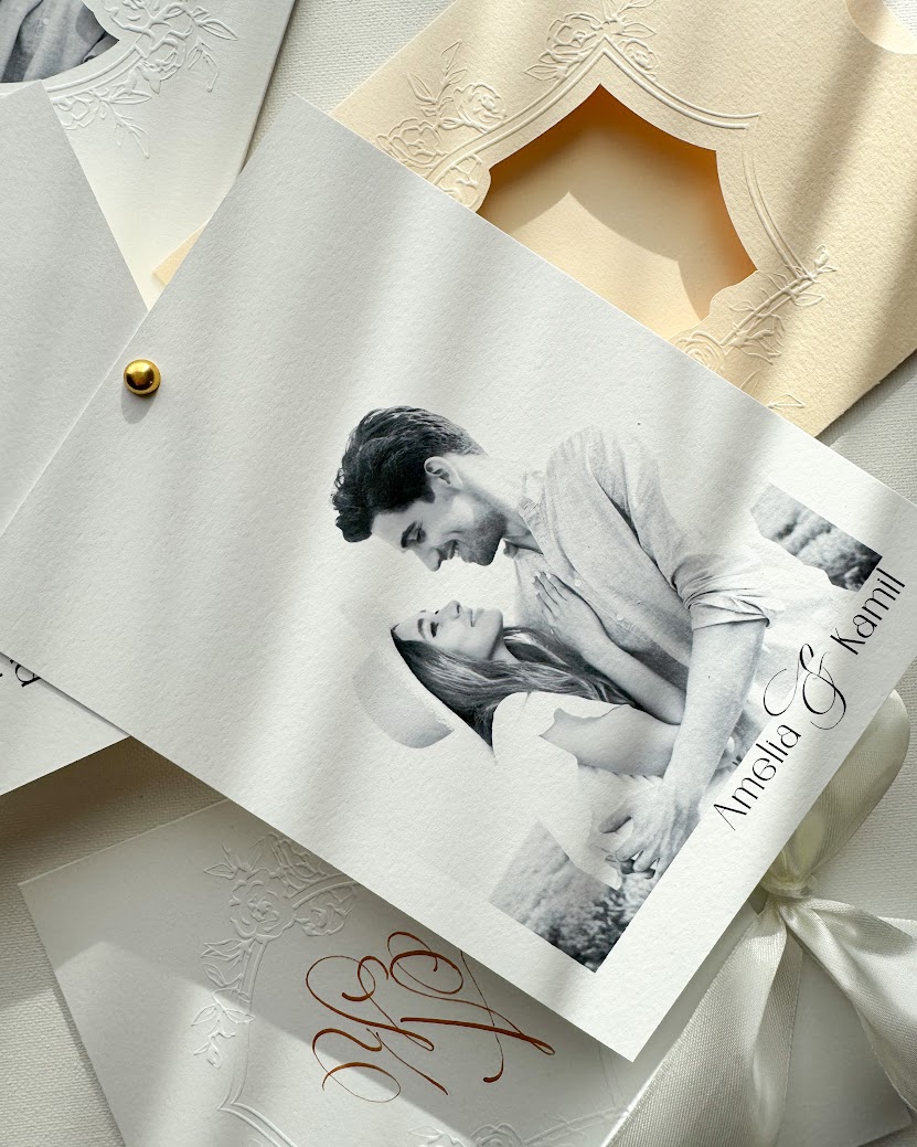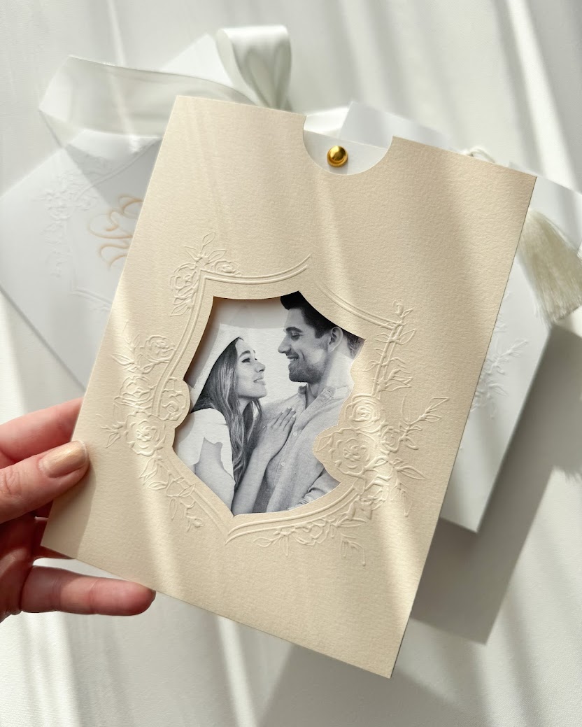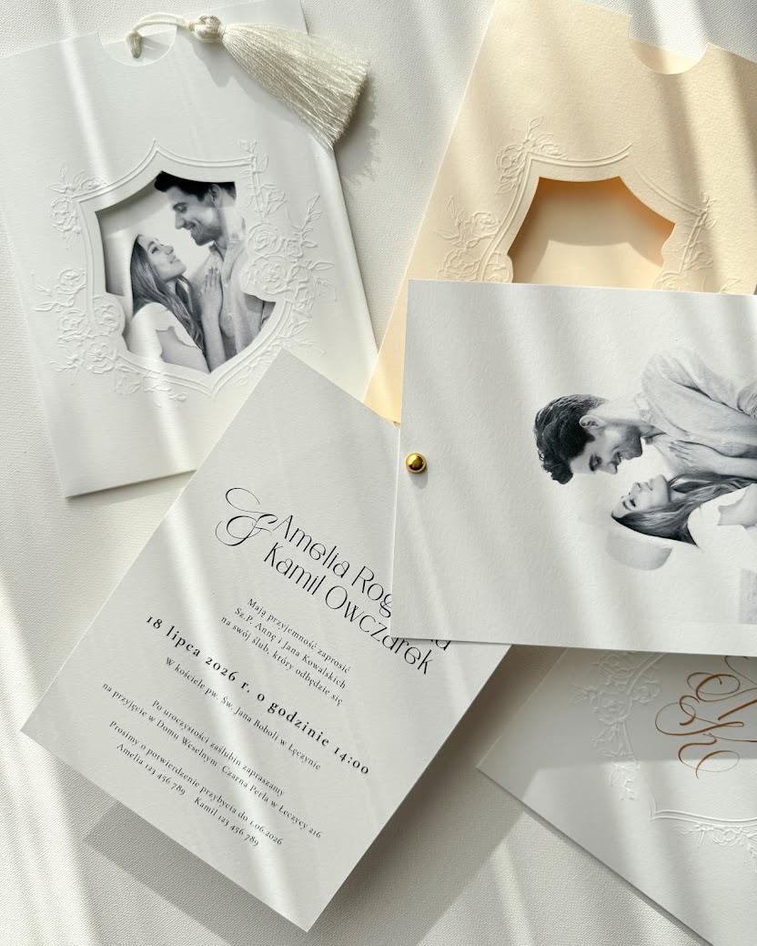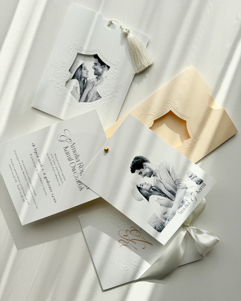 Całość zamknięta jest w kieszonce (300g) ze specjalnym wycięciem na zdjęcie z tłoczeniem wypukłym. Możecie również wybrać opcję kaligrafii imion – wtedy zamiast okienka, na froncie będą kaligrafowane inicjały.
