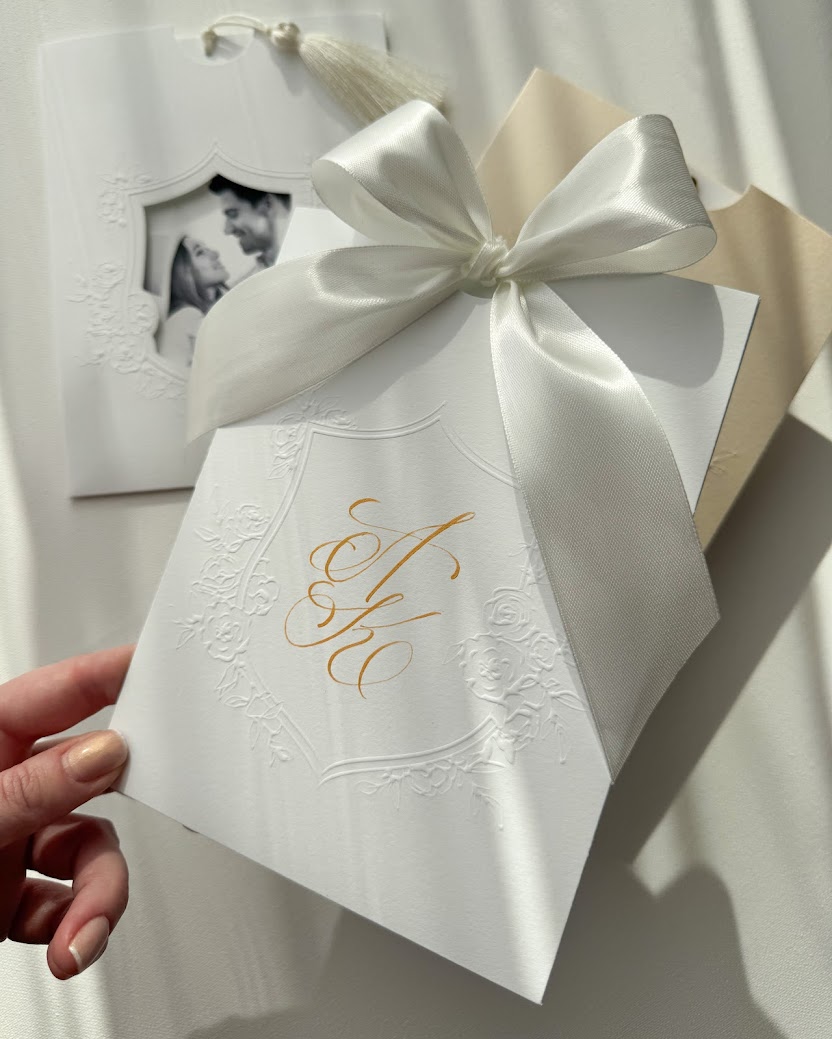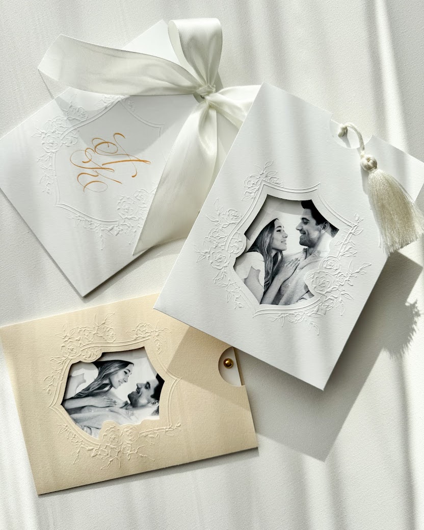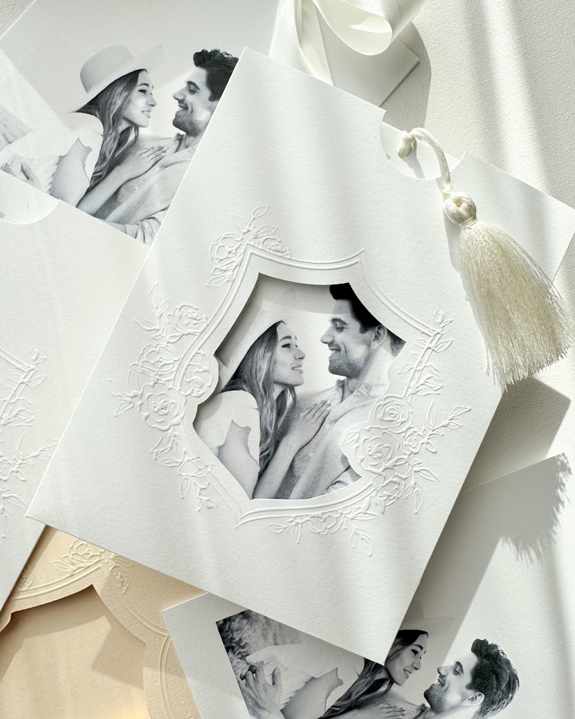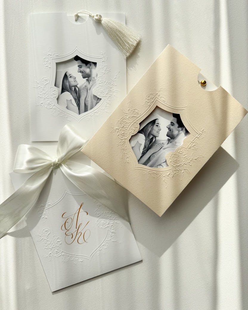 Całość zamknięta jest w kieszonce (300g) ze specjalnym wycięciem na zdjęcie z tłoczeniem wypukłym. Możecie również wybrać opcję kaligrafii imion – wtedy zamiast okienka, na froncie będą kaligrafowane inicjały.