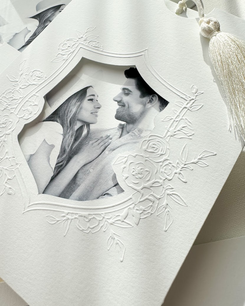 Zaproszenie Our Story z wypukłym tłoczeniem herbu z kwiatami, oraz okienkiem, przez które widać zdjęcie.